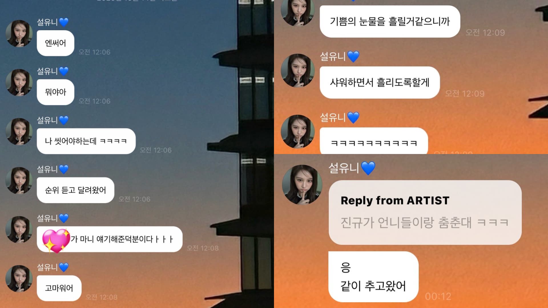 Sullyoon 笑說:「本來想去洗漱,但一聽到名次就立刻衝回來了,因為我可能會流下開心的眼淚,就乾脆洗澡時一起流吧!」,粉絲提到 Kyujin 和姐姐們跳舞慶祝時,她回覆:「嗯,我們跳完回來了~」,對於歌曲能衝上高名次,Sullyoon 表示依然難以置信,並感謝粉絲滿滿的支持與愛。