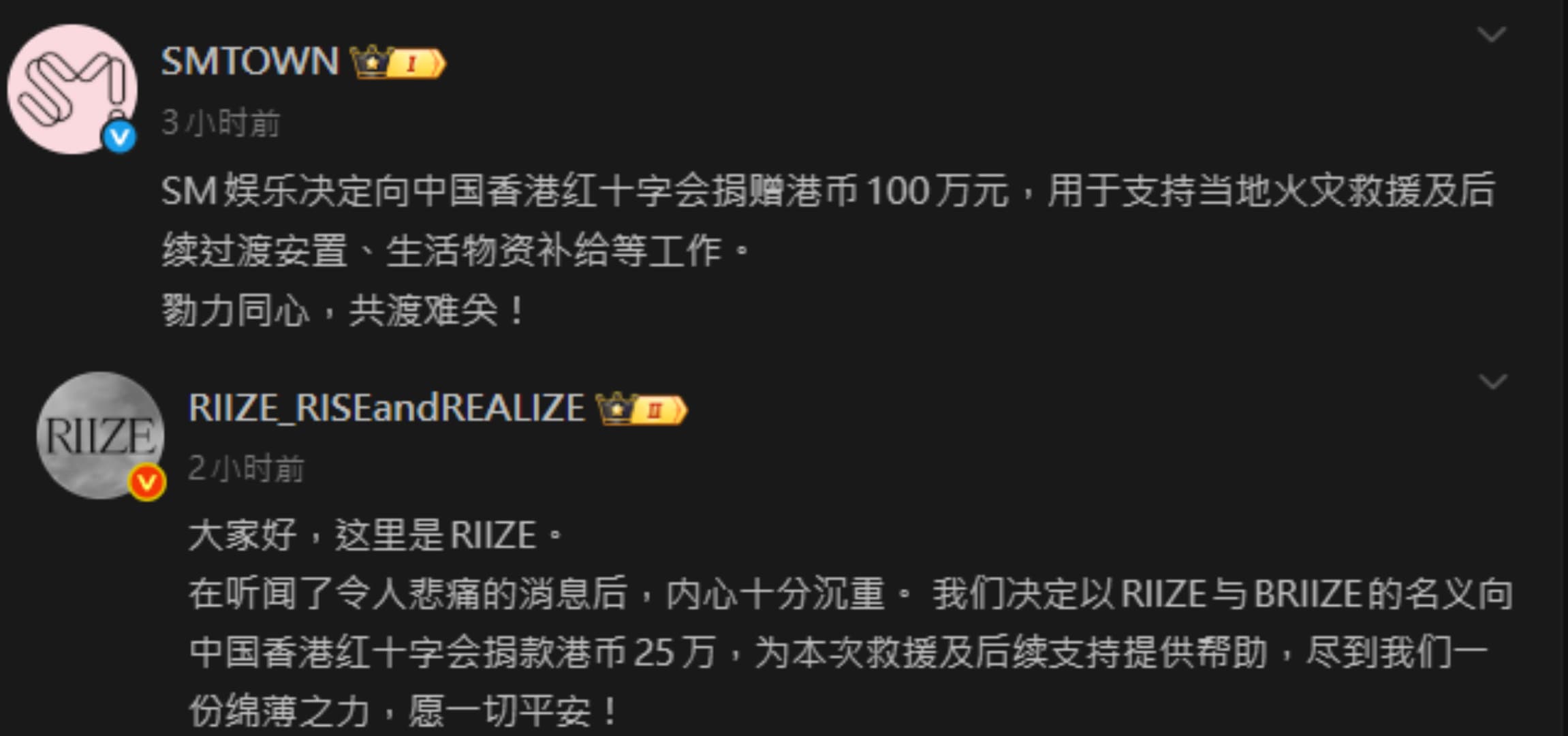 SM 娛樂於 27 日在中國社群平台微博宣布,向香港紅十字會捐出 100 萬港元,旗下男團 RIIZE 也以團體和粉絲名義捐出 25 萬港元。特別是 RIIZE 在聲明中表示:「在聽聞了令人悲痛的消息後,內心十分沉重。 我們決定以 RIIZE 與 BRIIZE 的名義向香港紅十字會捐款港幣 25 萬,為本次救援及後續支持提供幫助,盡到我們一份綿薄之力,願一切平安! 」