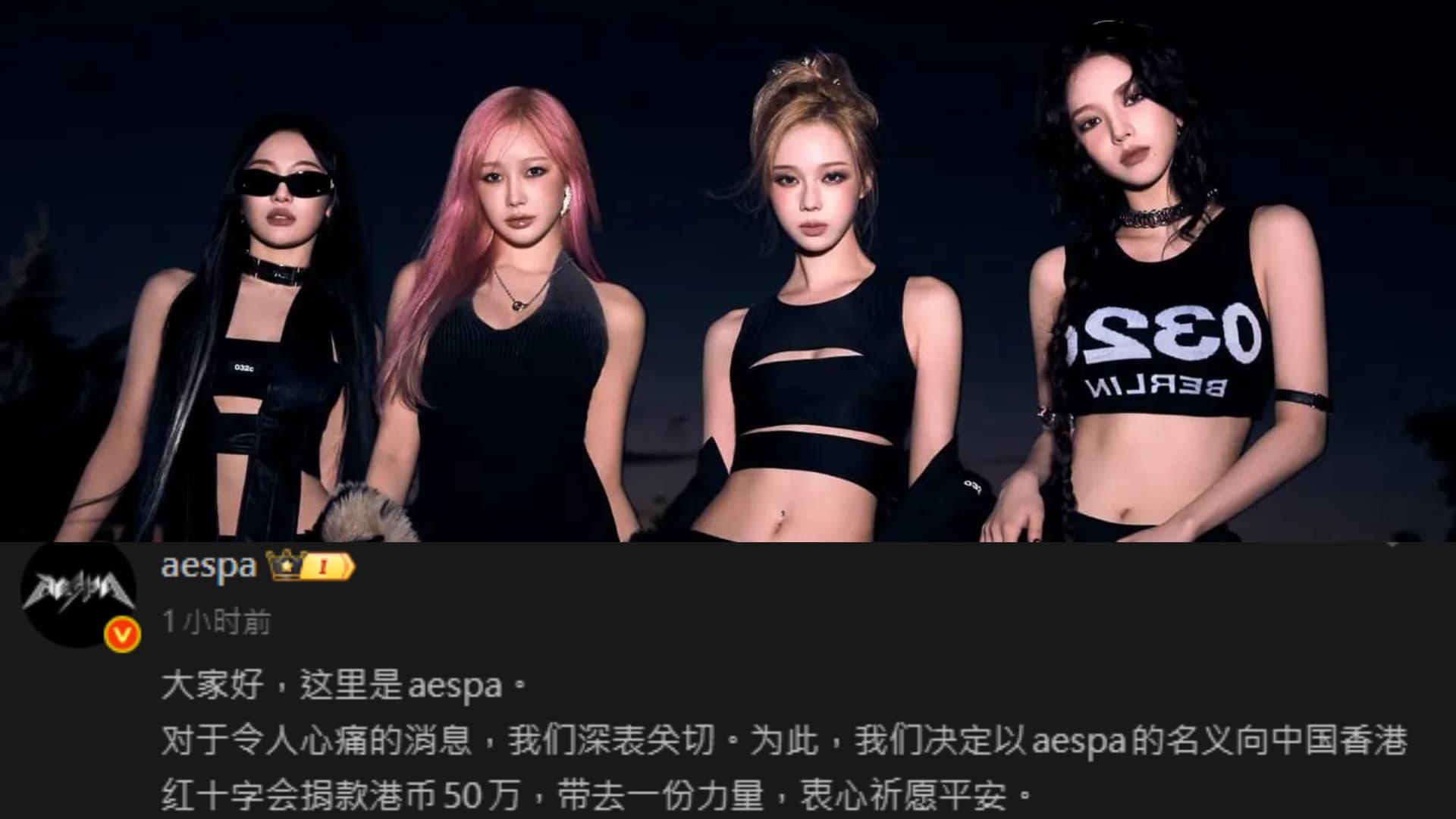 aespa 中國成員寧寧(Ningning)也在 IG 限時動態發文,用中文寫道:「願平安無事,請大家一定注意安全,致敬消防人員,為遇難人員默哀」。隨後 aespa 微博官方帳號也宣布捐款港幣 50 萬消息:「對於令人心痛的消息,我們深表關切。為此,我們決定以aespa的名義向香港紅十字會捐款港幣 50 萬,帶去一份力量,衷心祈願平安。 」
