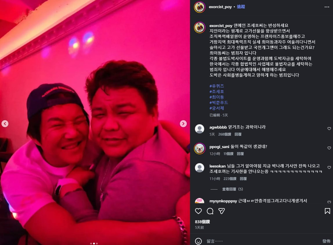 日前一個專門揭露非法放貸、投資詐騙與黑金洗錢的 IG 帳號,於 11 月 29 日貼出照片並寫道:「聽說這家由黑幫老大崔某實際經營的連鎖店,常有我最喜歡的搞笑藝人曹世鎬光顧,看來我也要去吃吃看」,照片中可見曹世鎬替該餐廳宣傳的畫面。