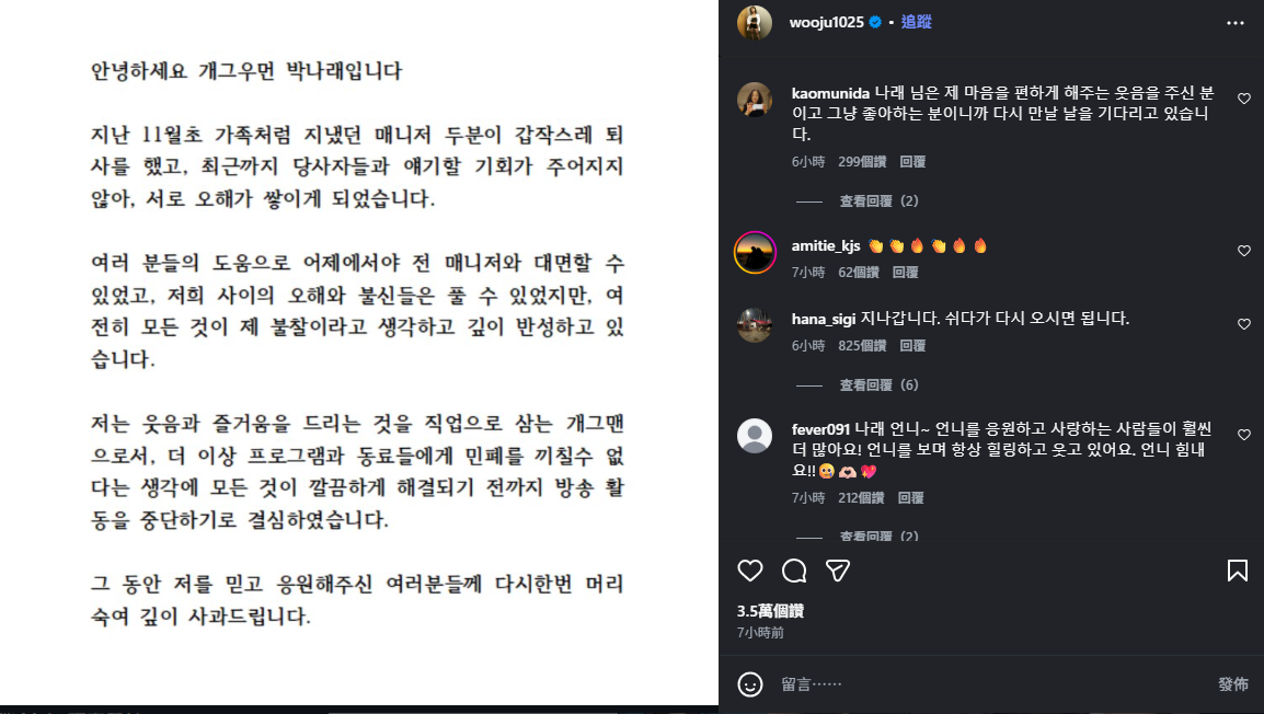 對於近日兩名前經紀人的接連爆料,朴娜勑解釋這是「誤會與不信任所造成的」,並透露自己已經親自與對方見面釐清。她表示:「11 月初,像家人一樣共事的兩位經紀人突然辭職,之後一直沒有機會當面談話,導致誤會不斷累積。直到昨天才終於見面,彼此也化解了誤會與不信任。」
