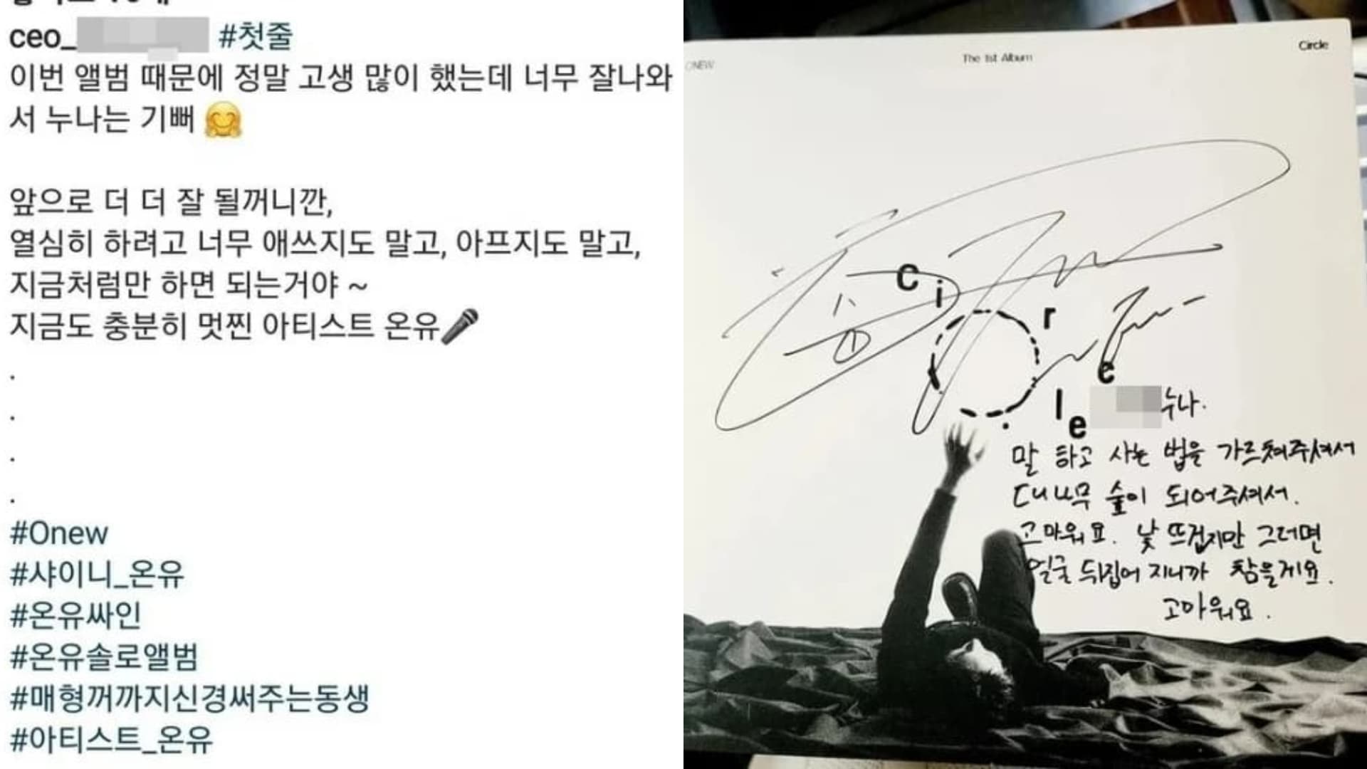 貼文附上的照片中,是溫流於 2023 年 3 月發行的首張正規專輯《Circle》的封面,上面有溫流親筆簽名與留言:「OO 姐姐,謝謝妳教我如何開口說話,謝謝妳成為我的樹洞。雖然有點害羞,但如果臉紅就太丟臉了,所以我忍住了。謝謝妳。」