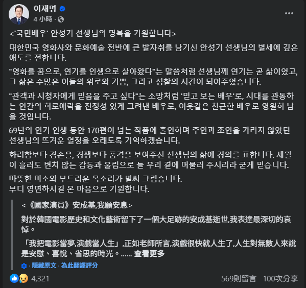 他也提到,安聖基長達 69 年的演藝生涯中參演超過 170 部作品,無論主角或配角都全心投入,「那份對演戲的熱情,將永遠被人們銘記」。最後,李在明以溫暖話語作結:「那柔和的聲音與親切的微笑,已讓人無比想念。誠心祈願老師安息」。
