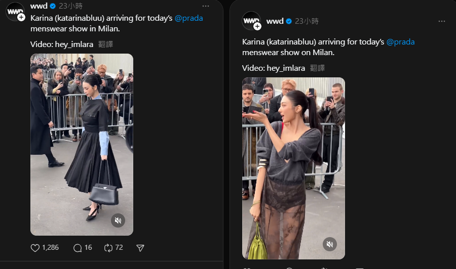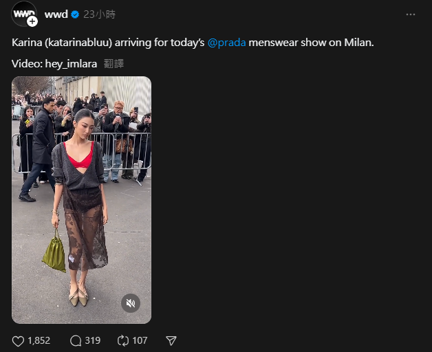 這名記者似乎沒有意識到錯誤,在社群發布的貼文中,仍寫道「Karina (katarinabluu) arriving for today’s @prada menswear show on Milan.」,甚至標記了 Karina 的 IG 帳號,隻字未提及 Gawon,將近一天仍未修正貼文。