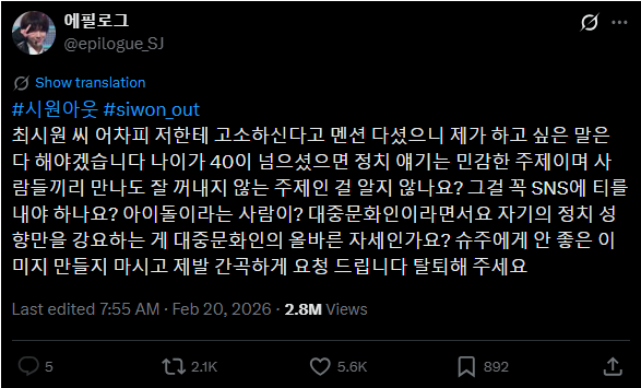 據了解,部分 SJ 粉絲在社群平台 X 上留言,希望他避免發表政治相關言論,擔心一時失言可能影響 Super Junior 的整體活動與形象。然而帳號卻遭到封鎖處理,引發粉絲不滿。隨著事件延燒,社群上陸續出現「siwon_out」、「始源out」等話題標籤,甚至有人嘲諷表示:「平常叫他議員,真的以為自己是議員嗎?趕緊退團去參選」。