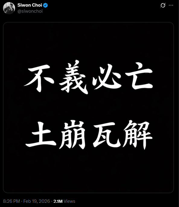 Super Junior 成員崔始源近日因一則貼文陷入政治風波,他在韓國前總統尹錫悅一審被判無期徒刑當天,突然發文寫下「不義必亡,土崩瓦解」八字,由於時間點過於敏感,引發外界聯想與各種解讀。隨後有粉絲留言呼籲他避免發表政治相關言論,未料卻遭到封鎖,憤而發起「siwon_out」要求他退團。面對風波持續擴大,SM 也做出強硬回應。