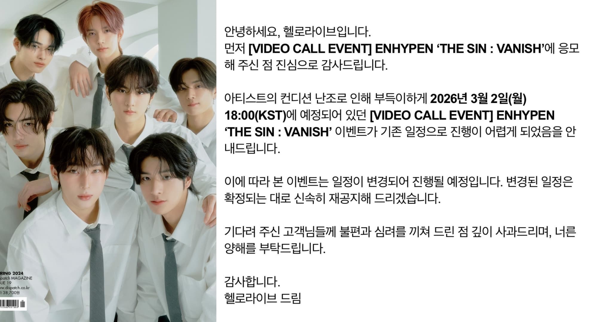 根據參與 ENHYPEN 迷他七輯《THE SIN : VANISH》視訊簽售的粉絲收到的通知,「由於藝人身體狀況不佳,活動將無法按照原定行程進行」,活動將更改日程後再行舉辦,具體時間將在確定後儘速另行公告。