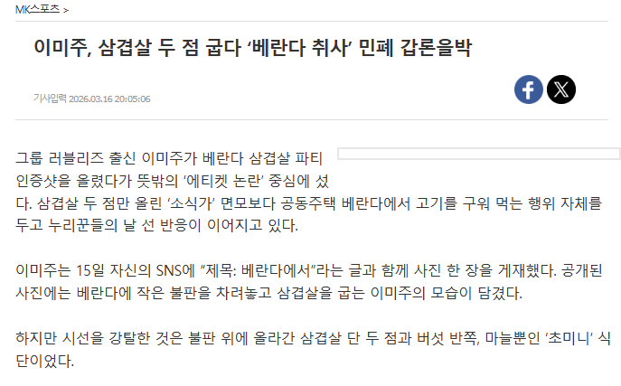 在韓媒《mksports》報導後迅速登上熱搜,讓「在公寓陽台烤肉」成為爭議焦點。有網友指出,公寓型住宅通風相通,煙味容易飄散到樓上或隔壁,可能讓鄰居衣物沾染氣味,甚至造成不適、缺乏公德心;但更多網友認為只要不是香菸,其他都是小問題,而且更讓人震驚的是,她只烤兩片肉,質疑記者自製所謂爭議。