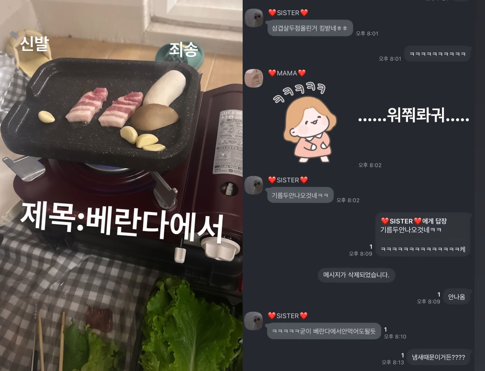 STAYC 成員 YOON(原報導寫錯人名)忍不住留言:「姐姐為什麼只吃兩片?」;連親姊姊都開酸:「這樣連油都不會出吧,真的讓人火大」。對此李美珠解釋,是怕燒焦才分批慢慢烤,也因為怕室內殘留味道才選擇到陽台料理。不過友人仍吐槽:「我還以為妳在擦烤盤」。