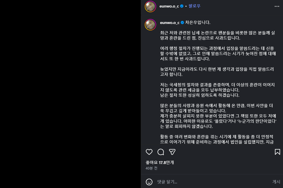 「臉蛋天才」車銀優入伍後爆出 200 億韓元逃稅爭議,他否認成立一人公司是為了逃稅,並對國稅廳的判定提出「課稅前適法性審查」,強調謙虛接受有關機關的最終判定。時隔多月,車銀優第二度透過個人 IG 發文向粉絲與大眾致歉,透露相關稅款已全數繳納,未來將以更嚴格標準檢視自身事務。