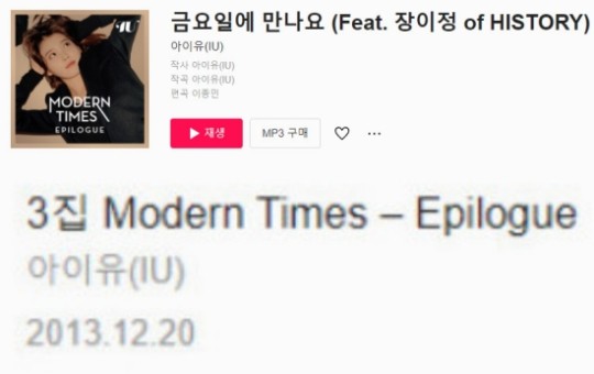 2013年發行的《Friday》是IU的代表熱門歌曲,也是長久以來的歌曲。 這首歌在1月29日~2月4日人氣歌曲排行榜中排名第77位,2月5日~2月11日的榜單中排名第69位,呈現出上升趨勢。