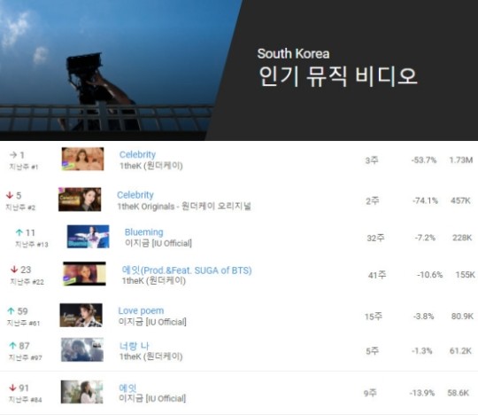 《Celebrity》MV排名第一,《Celebrity》Special Clip排名第5,《Blooming》演唱會Live排名第11位,《eight》(feat. SUGA of BTS) MV排名第23位,《Love Form》Live Clip排名第59位,《You&I》官方MV排名第87位。