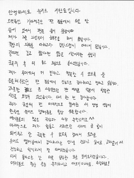 據經紀公司透露,池韓率正在準備Newkidd的新專輯,但最近接到了入伍命令,爲了履行國防義務,決定入伍。