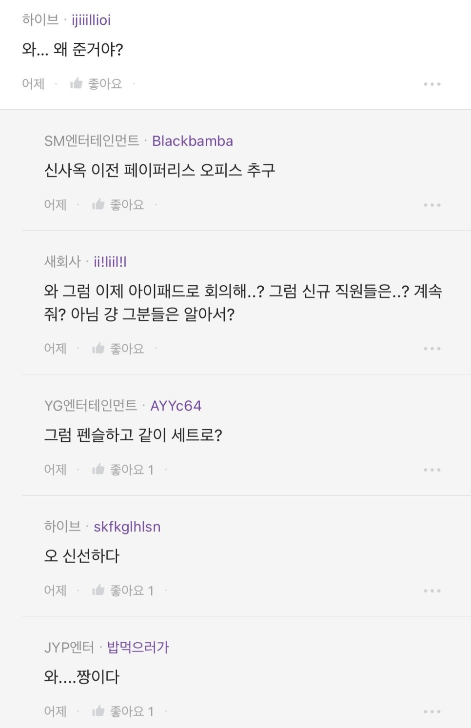一名 HYBE 職員問說:「哇…… 為什麼給?」,發文者回答「搬到新公司後要無紙化」,解答了疑問。 另一名HYBE職員說:「就給你了嗎? 不是因為工作而暫時提供的嗎?? 哇,太棒了」,發文者回答說「是有條件的,三個月內辭職的話就要交回去」,炫耀 SM 的福利。