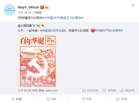一個典型的例子就是陷入中國夢的 SM Entertainment 的 WayV 和 NCT。 不久前,微博官方帳號上刊登「祝賀中國共產黨建黨 100 週年」的文章非常轟動。 從這一事例中可以看出,三大企劃公司中,比較缺乏特色的 SM Entertainment,其實就是迷戀「中國夢」最嚴重的企劃公司。 這不是代表部分人,而是在代表整個組合的官方帳號上很難區分其傾向,但即使考慮到爭議焦點,也可能是想在中國賺錢吧。