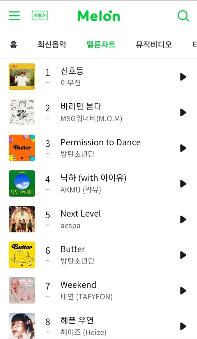 韓國最大的音源網站 Melon 恢復「實時排行榜」。 這距離去年 7 月因音源買榜爭議後取消「TOP 100」僅過了一年。Melon 在 9 日把榜單「24 Hits」和「最新 24 Hits」全面改編爲「TOP 100」和「Latest Chart」。