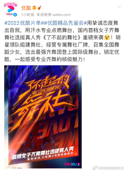 第二個是標榜是中國首檔女舞團真人秀《了不起的舞社》,聽到這裡是不是有種似曾相識的感覺呢。即使未有詳細的節目內容,但單從名字和簡介都已經能夠聯想到《Street Woman Fighter》。