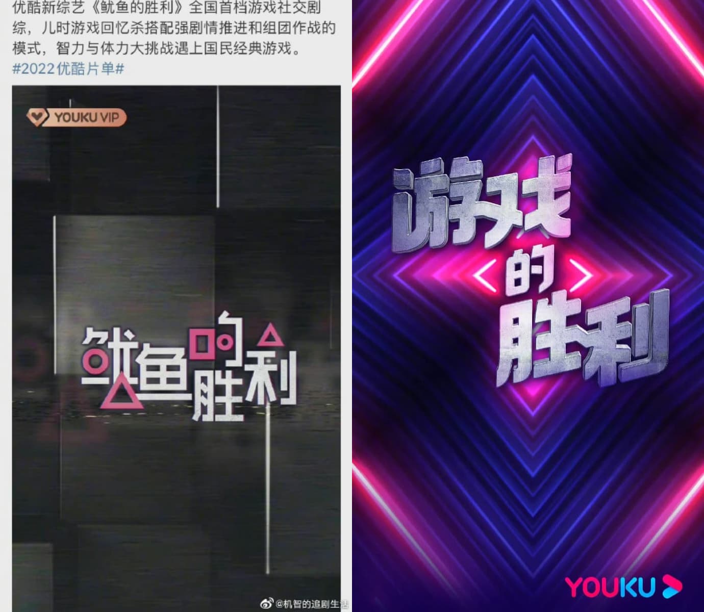 首先是綜藝《魷魚的勝利》,在片名、LOGO、節目定位都與《魷魚遊戲》十分相似。《魷魚的勝利》節目內容是「參賽者們將挑戰童年時期的遊戲,決出優勝者」。隨著爭議聲不斷,YOUKU 官方解釋說是「誤用已 BAN 掉的初稿」,並哂出新的海報《遊戲的勝利》。