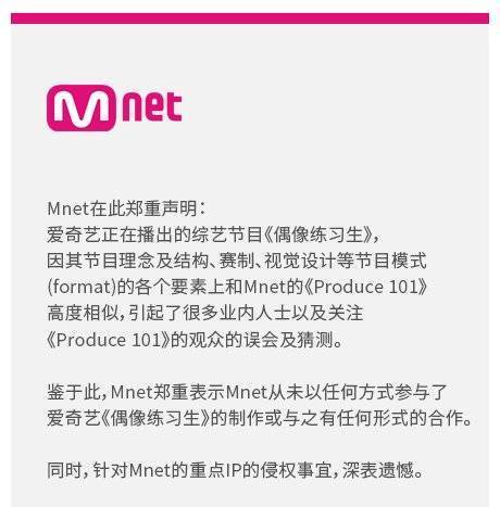Mnet 《Produce 101》官方更在微博發出聲明沒有與 iQiyi 合作《偶像練習生》,要求停止抄襲,可以看出製作者相當無奈的情況。