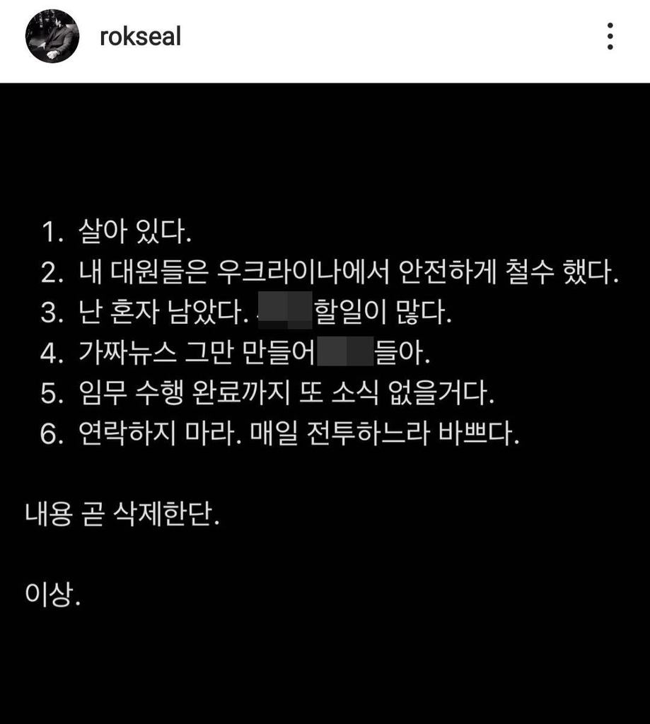 在引起討論一日後,「李根大尉」通過 IG 表示「我還活着」,並告知近況:「隊員們安全撤離烏克蘭」,李根說:「現在只剩他一人,有很多事情要做,停止製造假新聞。在完成任務之前,不會發布消息」。