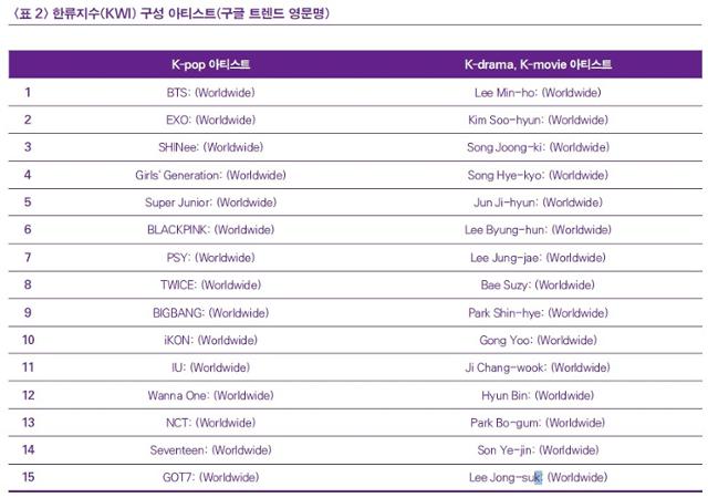 韓流指數是以 BTS 等 15 組 K-POP 團體和李敏鎬等 15 名演員、登錄在網路電影資料庫 IMDB 的韓劇前 100 位作品的谷歌搜尋量爲基礎構成。