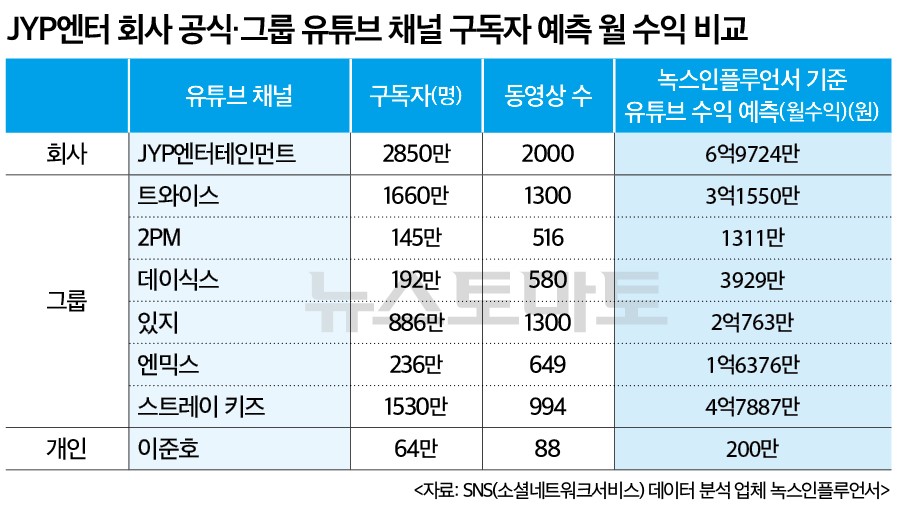 隨着專輯的發行,相關 YouTube 頻道的影響力也隨之增加。 新曲發表後,粉絲團比平時更頻繁地訪問頻道,頻道的月收入自然會上升。 JYP 所屬組合中,預測月收入超過億的 4 個組合 Stray Kids、TWICE、ITZY、NMIXX 去年平均發行了 2 ~ 3 張專輯。