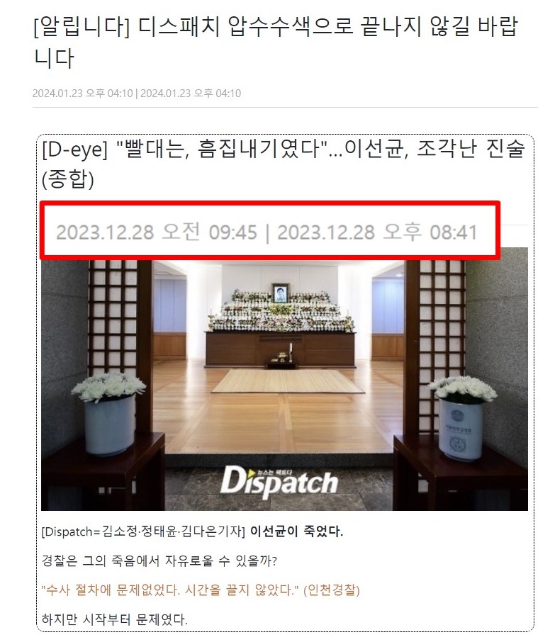 《Dispatch》在扣押搜查當天也以「希望事情不會以扣押搜查 Dispatch 而結束」為題發文,「京畿南部廳反腐敗調查隊對《Dispatch》進行扣押搜查,爲尋找公開警方事件報告書的途徑,沒收了採訪記者的手機和筆電」,並且列出其他韓媒也引用警方內部消息報導案件,《Dispatch》最後寫道「希望這次京畿南部廳的扣押搜查不要用於掩蓋警察的恥辱」。