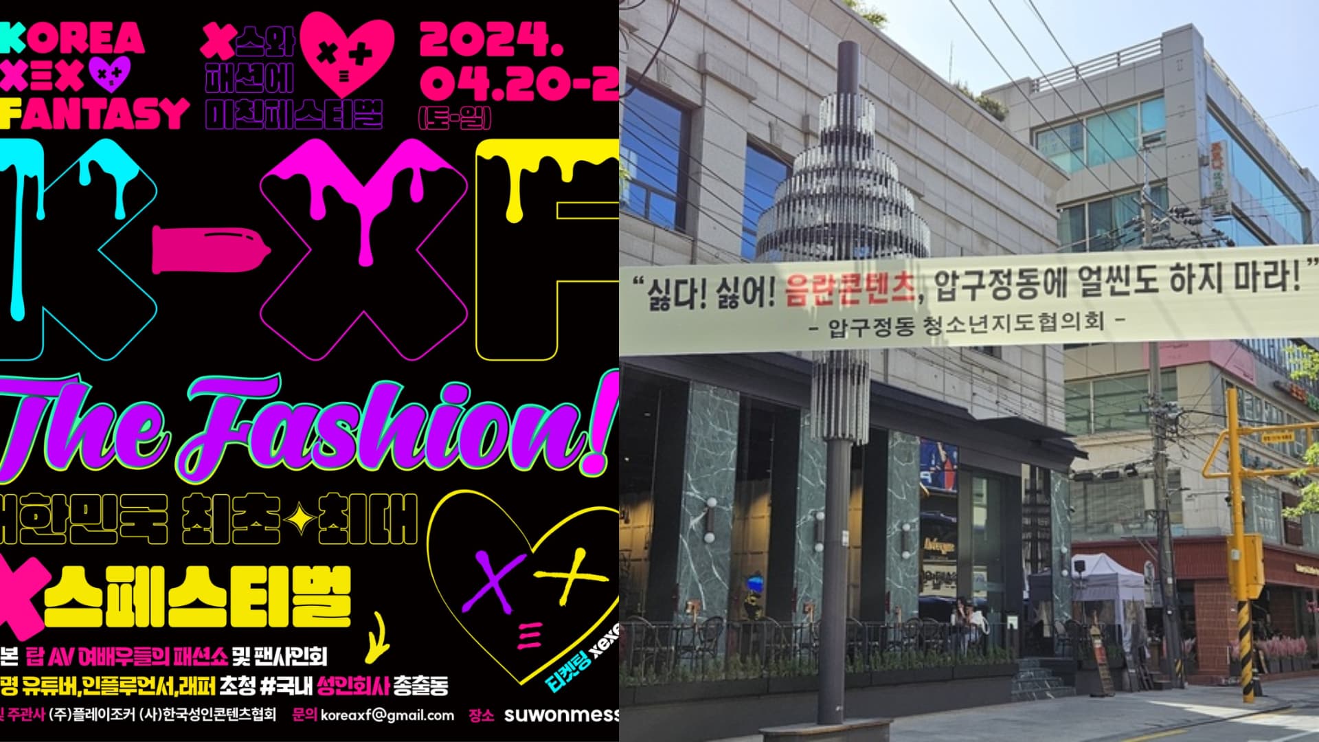 不同於台灣開放的性文化,成人展能夠盛大舉行。韓國主辦方也計劃於 20 ~ 21 日舉辦成人慶典《2024 K-XF The Fashion》,預告會有多位日本人氣女優出席。不過所到之處幾乎人人喊打,遭到當地政府和民間強烈反對,三度更改地點後,近日改為江南區新沙洞的一家酒吧舉辦活動,再被區政府威脅協辦者將受到「停業處分」。