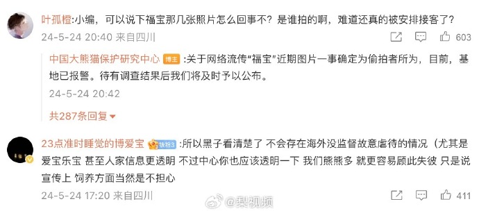 中國大熊貓保護研究中心則回應稱,「關於網絡流傳『福寶』近期圖片一事確定為偷拍者所為,目前,基地已報警。待有調查結果後我們將及時予以公布」,不過未能釋除外界疑慮,今(25)日下午官方公開福寶近況影片,但是目前所有留言區打開了「博主精選評論」,只剩下正面留言。