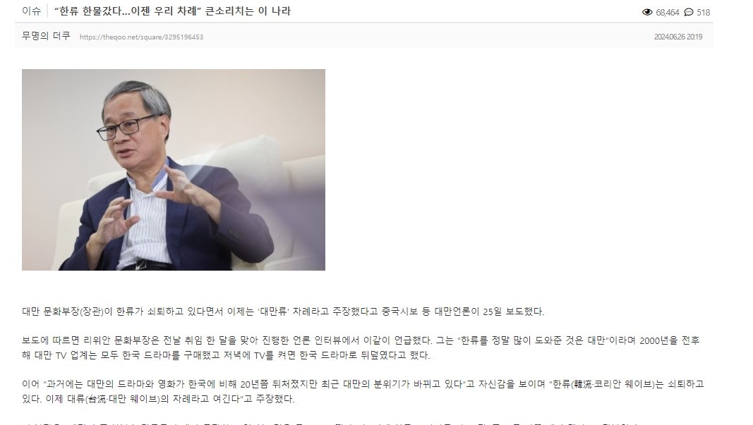 有網友以「韓流已經過時了,現在輪到我們了,大聲疾呼的這個國家」為題發文,引發熱烈討論,「這種不了解的人,能當文化部長嗎?」、「台劇不是減產很久了嗎」、「我反而覺得香港比較有機會」、「台灣的娛樂市場幾乎都被中國佔領了」、「說實話,我認為泰國比台灣更有潛力」、「以前真的很喜歡台劇,但他們稍微有點人氣就會去中國」、「台灣絕對不可能,還不如泰國的可能性更大」、「難道我們不能善意地競爭,互相尊重嗎?」、「台灣對韓國自卑感比我們鄰國還嚴重」、「據我所知,隨着中國資金流入台灣,自主能力下降,導致媒體質量下降」、「我比較了解台灣,但他們很可憐,一開始資本就輸給中國,拍攝人力也全部被搶走,所以應該沒有資格談論韓流什麼的,只要能站起來就好了」。