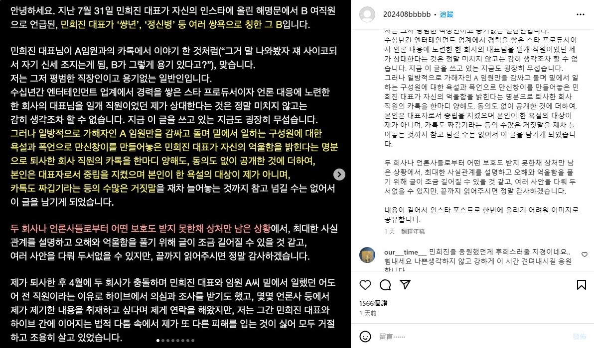 早前傳出閔熙珍涉嫌掩蓋 ADOR 副代表社內性騷擾女員工一事,雖然閔熙珍 IG 長文解釋了來龍去脈,自己在中間扮演調解人,但近日自稱是那位被侮罵女員工的網友發文控訴,自己無意捲入兩間公司紛爭,指責閔熙珍未經同意公開對話,拼湊聊天記錄,無法再忍受被利用編造謊言,要求閔熙珍和副代表作出真誠道歉。
