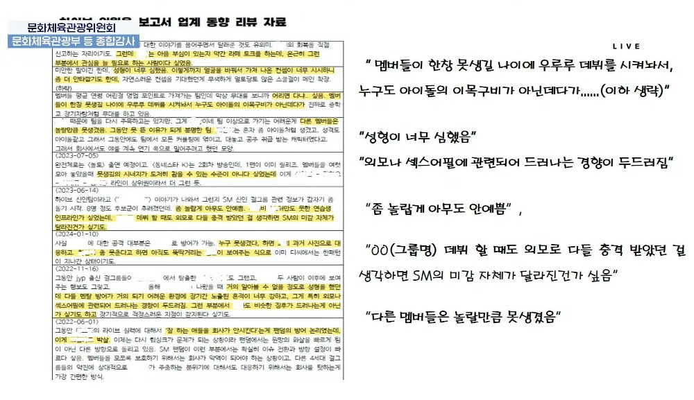 閔熙珍事件曝露了 HYBE 一連串內外部問題後,HYBE 首席運營官、BELIFT LAB 代表金泰浩出席國政監查接受國會議員質問,其中聽證會上公開一份 HYBE 內部文件的《每週音樂產業報告》,存在大量貶低包括三大社在內藝人的內容,如同 YT 頻道《脫粉收容所》一樣惡劣,再度讓 HYBE 成為眾矢之的。