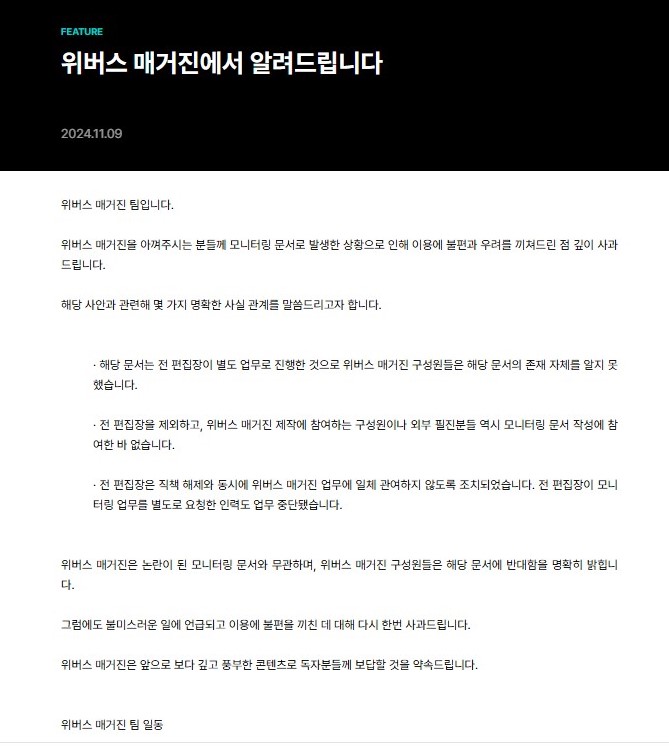 雜誌組表示,與引發爭議的文件無關,Weverse 雜誌成員明確表示反對該文件。儘管如此,對於不光彩的事情被提及,給使用帶來不便,再次表示歉意。承諾今後將以更深更豐富的內容報答讀者。