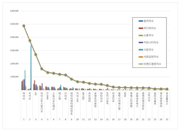 雖然韓國娛樂巨頭 HYBE 近期深陷醜聞,但在 8 月娛樂上市企業品牌評價中仍穩坐冠軍寶座。儘管評價指數較 7 月下滑 36.22%,依舊大幅領先其他對手。另一方面,KAKAO 憑藉旗下音樂與娛樂事業的強勁表現,品牌評價指數大漲 37.11%,成功超車 JYP;而 JYP 則因社群互動與媒體關注度減弱,名次退居第 3。