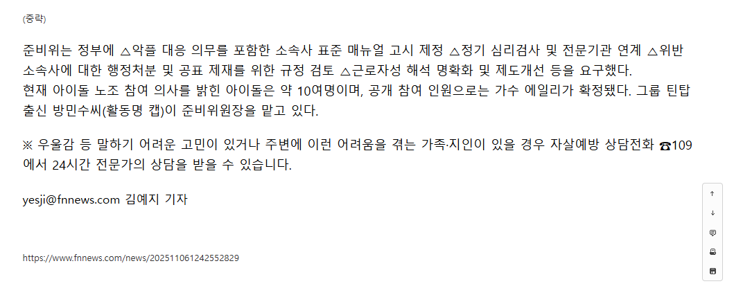 他們還指出,根據現行文體部公告的《標準專屬合約書》,藝人被定義為「執行業務委託的角色」,偶像(藝人)未被視為勞動者,因此難以適用《產業災害補償保險法》及《重大災害處罰法》等法律。由於在法律上「不屬於勞動者」,所以沒有工傷保險、四大保險也缺席,也不適用《職場霸凌禁止法》, 有「工作」卻沒有「法律保障」。