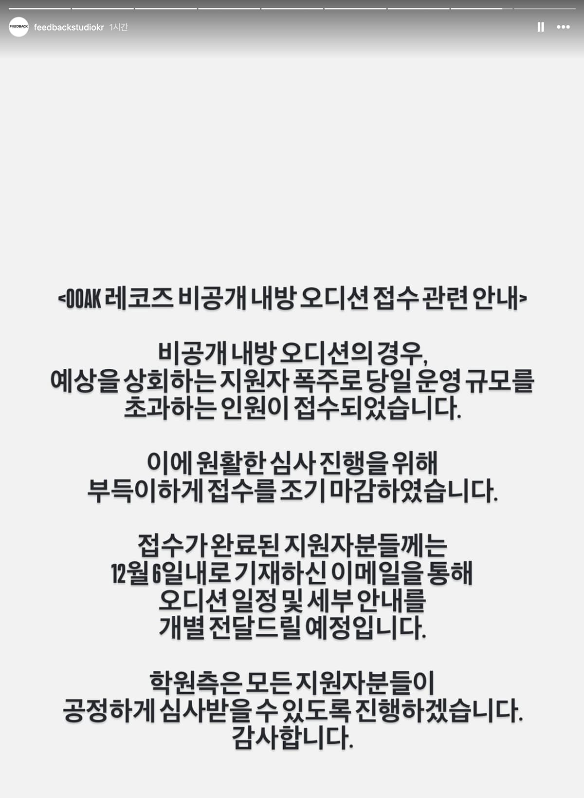 值得一提的是,日前有消息傳出 ooak Records 將於 7 日在知名舞蹈學院舉行非公開面試,似乎經過韓媒助攻後,吸引大批人報名。「Feedback Dance Studio」今(4)日於限時動態發文表示,「由於收到遠超預期的大量報名,單日可運作的規模已超出負荷。為了能順利且妥善地進行後續評選,只能提前結束報名。(Jam Republic 隊長 Kirsten、OSAKA Ojo Gang 隊長 KYOKA,以及 NewJeans 表演總監 BLACK.Q 也曾在此授課)