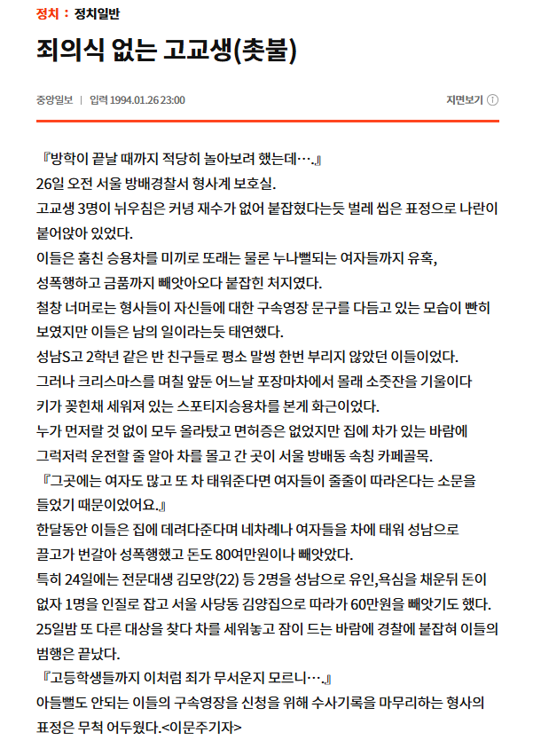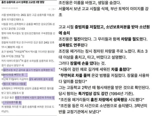 有網友在社群重新貼出一篇 1994 年 1 月 26 日刊登的舊報導,該報導標題為〈偷開轎車性侵少女的高中生 3 人被申請拘捕令〉,內容指出,首爾方背洞警察署以「特殊竊盜」及「強盜強姦」嫌疑,對三名高中生申請拘捕令。