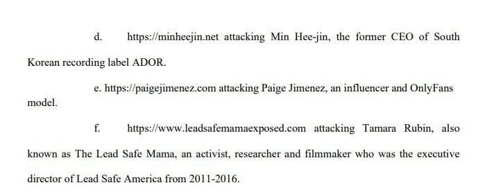 訴狀中特別引人注目的,是列舉的攻擊性網站名單。原告提及:「發現有多個採取類似手法的攻擊性網站與社群帳號」,並舉例其中之一為「minheejin.net」,指出這是「針對韓國音樂廠牌 ADOR 前代表閔熙珍進行攻擊的網站」。同時還列出多個針對他人的網站,如美國演員 Alexa Nikolas、網紅 Paige Jimenez、環保人士Tamara Rubin等,原告稱這些網站同樣出自被告之手。