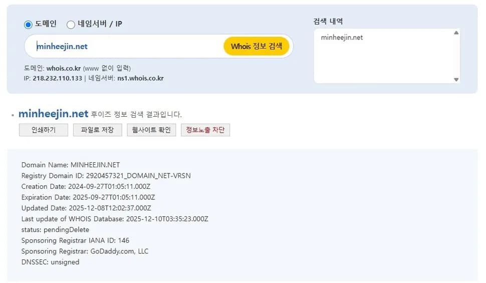 目前「minheejin.net」已不存在,無法確認其內容。根據域名資訊服務 Whois 查詢,「minheejin.net」建立於 2024 年 9 月 27 日,正是 HYBE 收購 TAG PR 後不久,域名於一年後的 9 月 27 日到期沒有再續約。巧合的是,去年 9 月 27 日也是閔熙珍出席信用卡公司主辦講座的日子。
