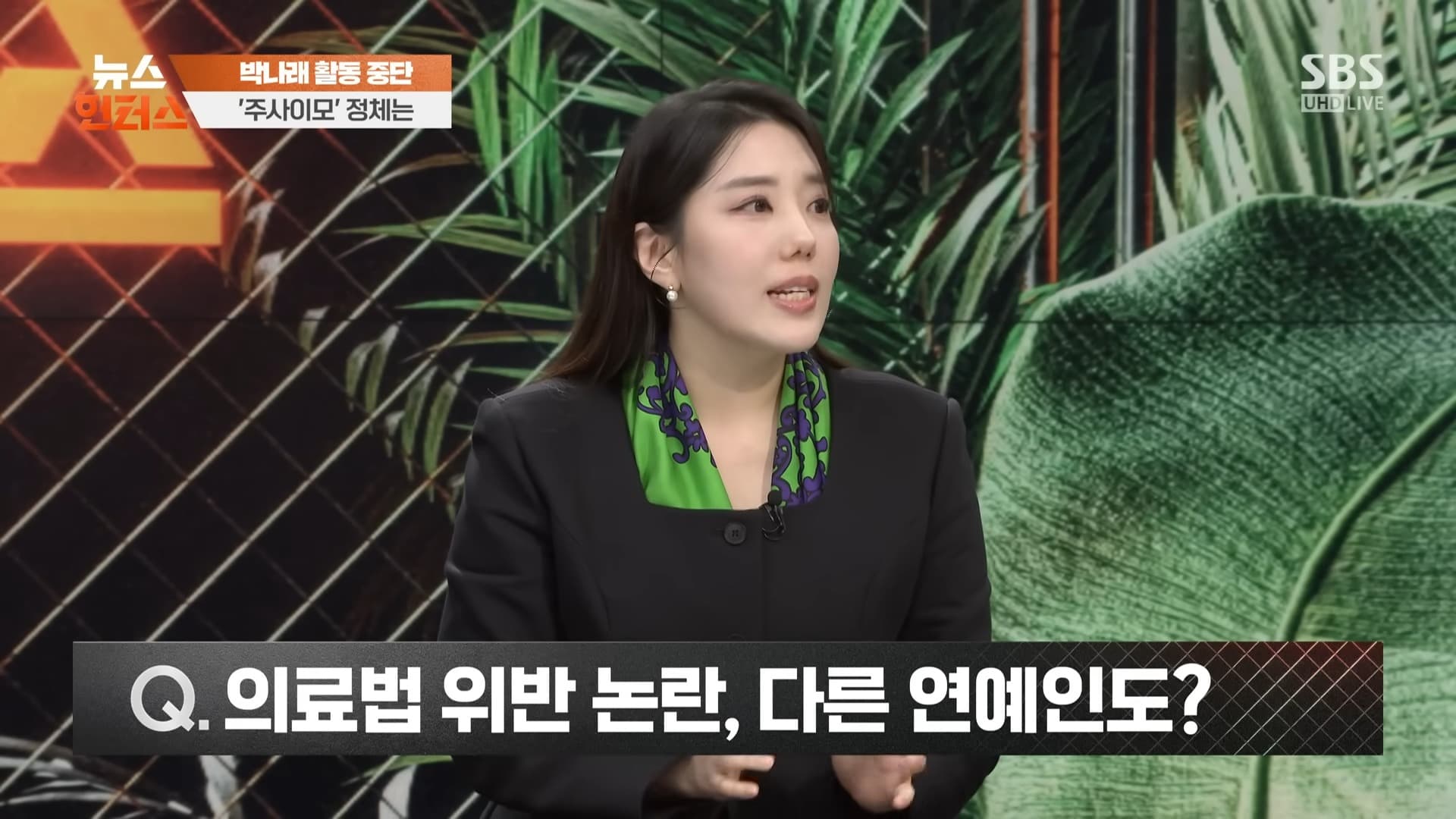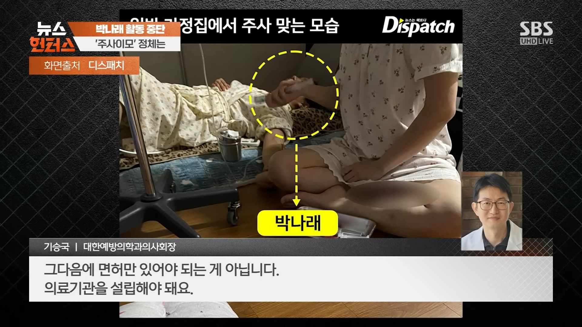 SBS 時事節目《News Hunters》日前針對朴娜勑「非法醫療疑雲」進行深度報導,邀請娛樂部記者崔貞雅與律師任珠惠解析案件焦點。兩人指出,所謂替朴娜勑施打藥劑的「打針阿姨」是否具備韓國醫師執照,以及若使用到向精神性藥物,是否經由合法「面診」開立處方,都將成為關鍵法律爭點。