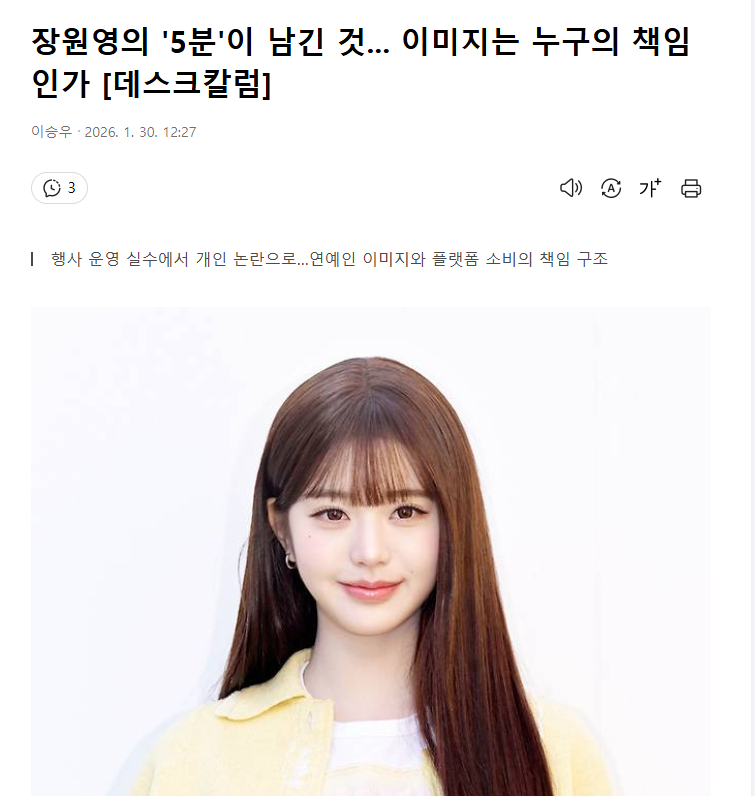 隨著主辦方當晚緊急滅火,卻為時已晚換不回名譽。韓媒《MHN Sports》局長發表一篇專欄文章,題為「張員瑛的『五分鐘』留下了什麼……形象究竟該由誰負責?」:原本只是品牌活動上的小插曲,卻因為短短幾支影片、幾句煽動性文字,被放大成『大牌遲到』的形象爭議。如今真相曝光,藝人的形象,究竟應該由誰來負責?