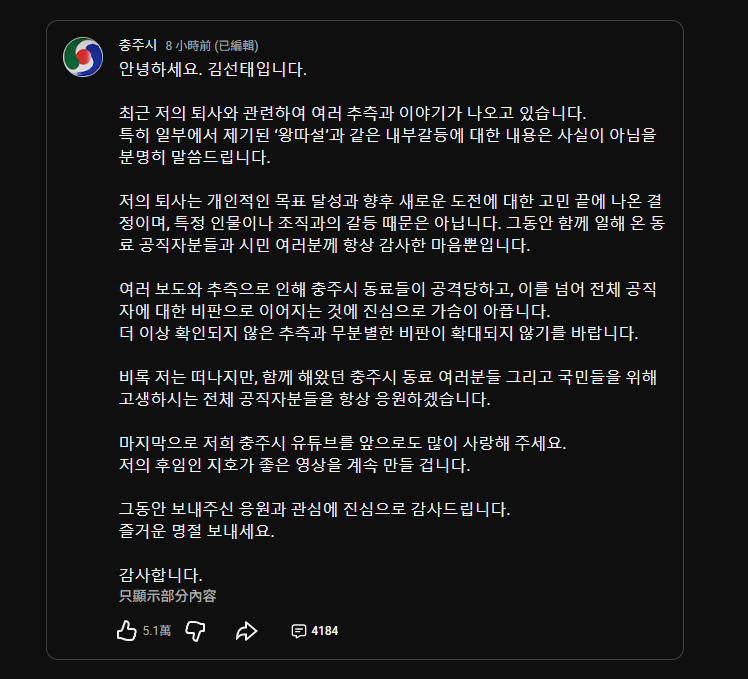 負責經營忠州市官方 YouTube 宣傳頻道的公務員金善泰,因無厘頭又接地氣的內容風格,以「忠州男」之名爆紅,頻道訂閱數一度逼近100 萬,成為地方政府宣傳的成功案例。然而他近日閃電宣布辭職,隨後更傳出他因短時間內連續升遷,引發內部不滿,甚至有同為公務員的人士在他離職後發文「拍手叫好」,讓事件延燒出職場霸凌疑雲。風波持續擴大之下,頻道訂閱數短短兩天內流失超過二十萬人。面對各種傳言,「忠州男」也親自發文出面澄清,試圖平息爭議。