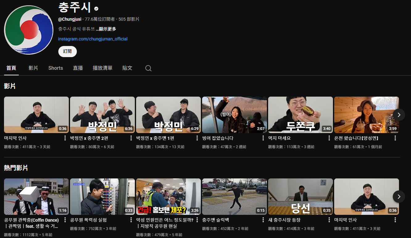 「忠州男」自 2018 年成為 Facebook 宣傳管理員後,他以帶有搞笑、無厘頭風格的宣傳內容獲得高度人氣;並在這股熱度的基礎上,於一年後的 2019 年推出地方政府首個走「B級風格(非主流)」的 YouTube 頻道,一舉爆紅。從企劃、拍攝、剪輯到來賓邀約,全部工作都由他一人獨立完成。