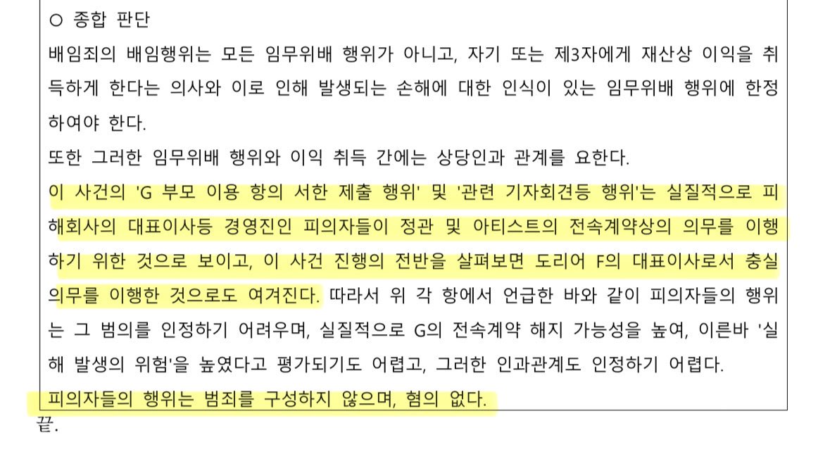 而在警方的「背信罪」無嫌疑結論,提到關於「G 父母提交抗議書面行為」及「相關記者會等行為」,實質上可視為被害公司的代表理事等經營陣營的被告們,為了履行與藝人的專屬契約上的義務而採取的行動;並且從本案進行的全貌來看,也可認為是 F 以代表理事身分,履行忠實義務的一部分。