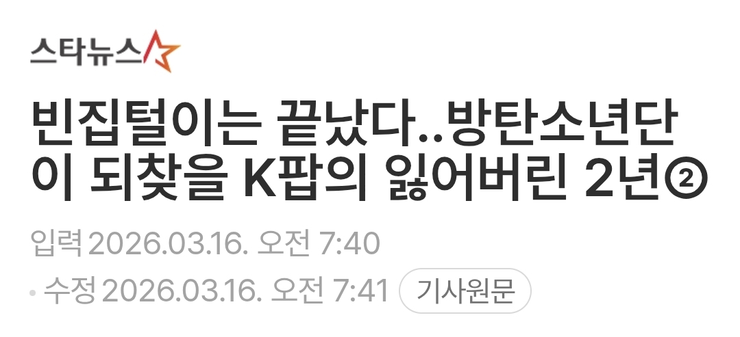 韓媒《STARNEWS》今日連續發表多篇以「空屋時代結束了……防彈少年團將奪回 K-POP 失去的兩年」為題的文章,指出 K-POP 在 BTS 軍白期兩年多停滯不前,許多團體趁著他們入伍搶奪空白市場,如今真正的主人,終於到了奪回失去兩年的時刻。