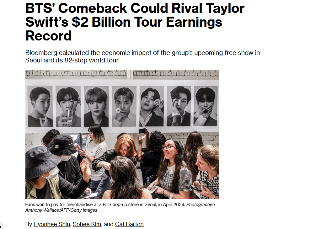 (注:彭博社原標題為 BTS’ Comeback Could Rival Taylor Swift’s $2 Billion Tour Earnings Record;BTS 回歸預計將與泰勒絲 20 億美元的巡迴演唱會收入紀錄相媲美;撰文者兩名為韓國人)