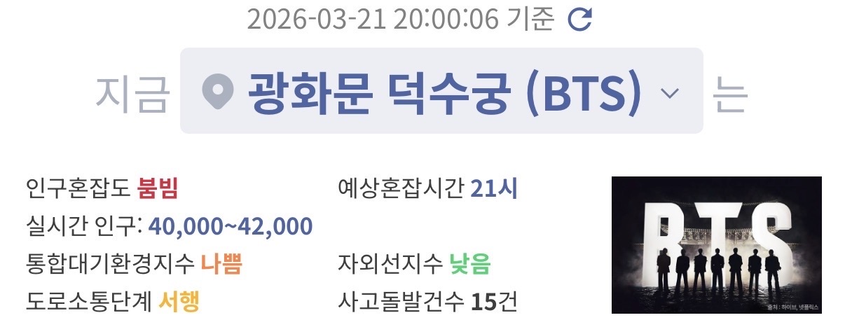 根據《週刊朝鮮》報導,首爾市實時城市數據及警方推算,截至當晚 8 時,光化門廣場與德壽宮一帶的滯留人數約為 4 萬至 4 萬 2000 人,人數甚至低於年輕人聚集地弘大的 11 萬人,讓一切安排都顯得小提大做。而主辦單位 HYBE 則聲稱,「約有 10.4 萬人聚集在光化門廣場」,全球 190 個國家和地區的超過 3 億人透過 Netflix 即時觀看回歸演出。