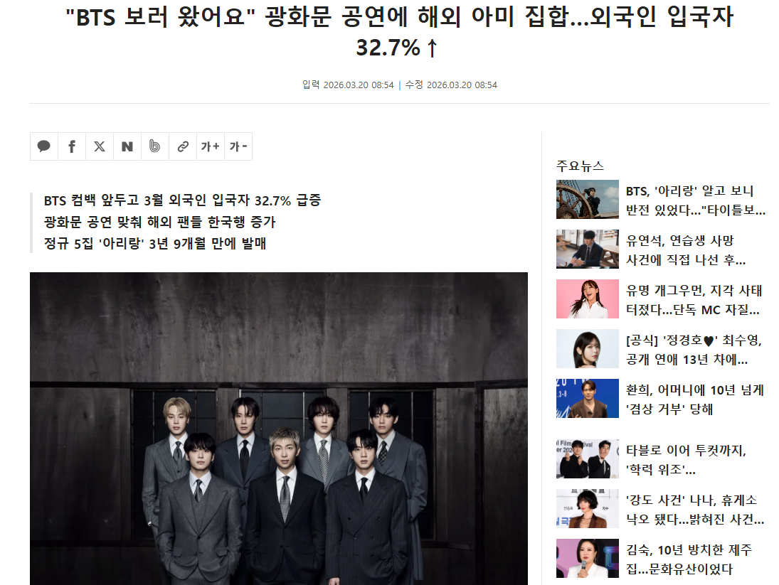 有趣的是,《10ASIA》則以另一個角度報導參與人數,根據韓國法務部出入境與外國人政策本部 20 日公布的數據顯示,今年 3 月 1 日至 18 日入境韓國的外國人共 109 萬 9,700 人,較去年同期的 82 萬 8,500 人增加約 27 萬人,成長幅度達 32.7%。報導形容人數增長與 BTS 回歸演出有密切關聯。若再加上 19、20 日陸續抵韓的粉絲,入境人數甚至有機會比去年同期暴增超過 5 成。