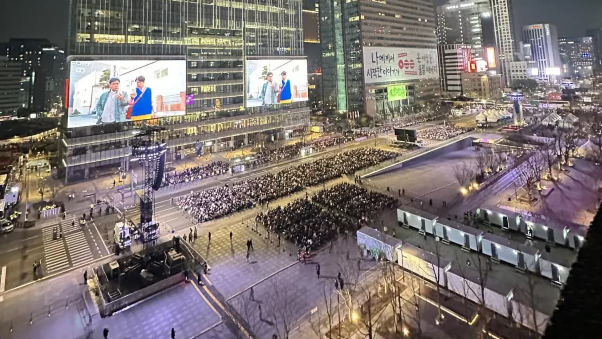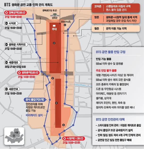 韓國警方原先預估,現場最多可能湧入 26 萬人到場觀看,因此提前加強部署。但在當天晚上 8 點正式開唱時,根據首爾市即時城市數據顯示,光化門與德壽宮一帶約聚集 4 萬至 4.2 萬人,警方的非正式估算數字也約為 4.2 萬人。根據《韓國日報》報導,由於實際人數低於預期,劃分的觀賞區域(熱區,僅限 10 萬人)無須實施額外出入管制措施。警方後續表示演唱會結束 9 點後,估計有 7.7 萬至 8.3 萬人聚集在光化門一帶。(注:演出場分為四區:觀眾席為核心區、熱區、溫區與冷區,當中只有核心區需持票入場)