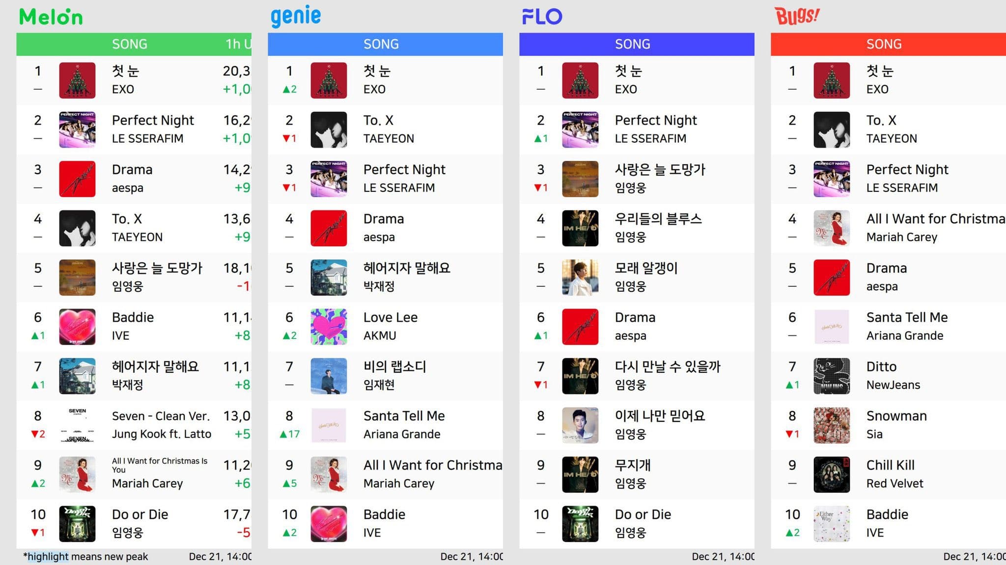EXO〈初雪〉是 2013 年 EXO 冬季特別專輯的收錄曲,距離發表至今已有 10 年,被韓媒形容為 EXO 的年金歌曲。雖然每年冬季都會逆襲榜單,但是超越熱門人氣曲,登上排行榜 1 位尚屬首次。隨著〈初雪〉在 21 日中午 1 點重奪 Genie 實時榜 1 位,加上 Melon、FLO、Bugs ,〈初雪〉在所有韓國音樂平台達成實時 1 位(RAK),同時 EXO 也是 2023 年第一組達成 RAK 的男團。